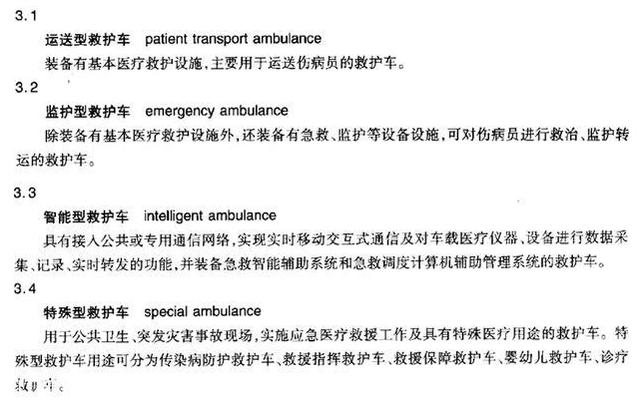 國家質量監(jiān)督檢驗檢疫總局發(fā)布的GB/T 17350-2009《專用汽車和專用掛車術語、代號和編制方法》、工信部2014年3月1日實施的QC/T 457-2013《救護車》、衛(wèi)生部2008年4月1日實施的WS/T 292-2008《救護車》,都對救護車有著各自的定義。
