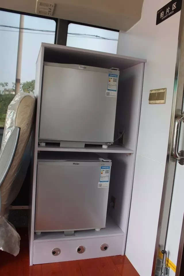 體檢車上配備4臺空調(diào),2臺海爾小冰箱,一臺實木儲物柜
