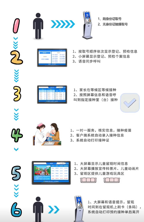 第一步,預防接種的叫號機刷身份證取號無身份證觸摸取號兩種方式。第六步,大屏幕名字顯示和語音呼叫,留觀時間到了后再機器上刷卡后系統(tǒng)自動打印預約接種單就可以離開。