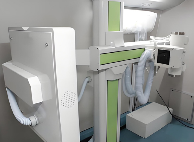首先按下綠色的電源開關按鍵,整個車載DR設備就會通電。再按下高壓發(fā)生器的開機鍵,然后電腦主機也開機運行。打開DR工作站系統(tǒng),它開機的話有一個過程,需要幾分鐘時間,DR室門口有門開關跟當心電離輻射提醒標志。檢查室里面有按鈕可以把設備調高調低,檢查時候這個手背著臀部上一點點,反向胸部靠著DR,通過升降來調整擺位的一個狀態(tài)。還可以通過搖把來調整探測器跟球管的高度。還有線束器的一個調節(jié)。我們一般拍胸片的話,一般不用管這個操作。 一般出廠設置跳到了一個合適的范圍了??刂破脚_也是可以控制開關門,并不需要按門口的按鍵。