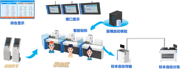 采血流程:患者到窗口采血-掃碼或讀就診卡-核對(duì)檢驗(yàn)項(xiàng)目-打印標(biāo)簽-選擇試管-粘貼試管-護(hù)士采血。人工采血存在問題人工選管、打印、粘貼,勞動(dòng)強(qiáng)度大。容易出現(xiàn)人為錯(cuò)誤。貼歪、貼倒(不能識(shí)別)。位置錯(cuò)誤(流水線無(wú)法識(shí)別)。視窗覆蓋(無(wú)法觀察血液情況)??赡艹霈F(xiàn)漏采或多采血。智能采血設(shè)備解決采血人的排隊(duì)難題,智能采血管理系統(tǒng)把采血管的準(zhǔn)備工作自動(dòng)化,縮短等待時(shí)間。采血流程需要全面的優(yōu)化,報(bào)到取號(hào),65歲以上老人優(yōu)先。智能叫號(hào)不需要長(zhǎng)時(shí)間的排隊(duì)。采血管容量大,處理速度快,能有效加快采血速度,提高采血服務(wù)質(zhì)量。自動(dòng)化代替了傳統(tǒng)人工的操作模式。自動(dòng)識(shí)別自動(dòng)貼標(biāo),自動(dòng)標(biāo)本核收。大大的減少人工誤差。也減少繁雜的采血前準(zhǔn)備,系統(tǒng)具有諸多優(yōu)勢(shì),將為客戶帶來(lái)全新的體檢體驗(yàn)。