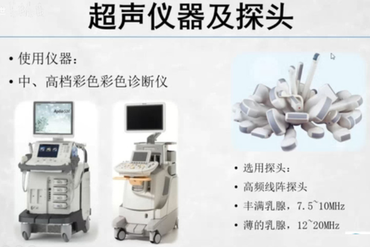 那么使用的設備呢要求是中高檔的彩色診斷儀。探頭型號非常的豐富,針對不同的器官采用不同的探頭。檢查乳腺使用高頻線陣探頭,穿透力分辨率,豐滿乳腺,采用7.5~10MHz探頭,薄的乳腺乳腺小的患者,采用12~20MHz探頭。乳腺的掃查方法有兩種,看個人的習慣,一是從上到下,左到右,移動探頭逐一切面掃描探頭不要跳躍。采用聯(lián)網(wǎng)式,二是順時針或者逆時針方向,由乳頭為中心輻射狀掃描檢查。乳頭向外掃查,乳頭向內掃查都可以。最重要的也是探頭不要跳躍,一定要采用聯(lián)網(wǎng)式的檢查。采用哪種方法,按照習慣選擇。乳腺的掃查的范圍有外向內向外線內線,乳頭中央?yún)^(qū)、向外延伸的腋尾區(qū)、腋窩、淋巴結四個象限。疊瓦式,剪草機式不放過任何位置。正常乳腺超聲標準斷面,經(jīng)乳腺腺體最厚處、通常于外上象限取得,在此段面測量乳腺厚度。