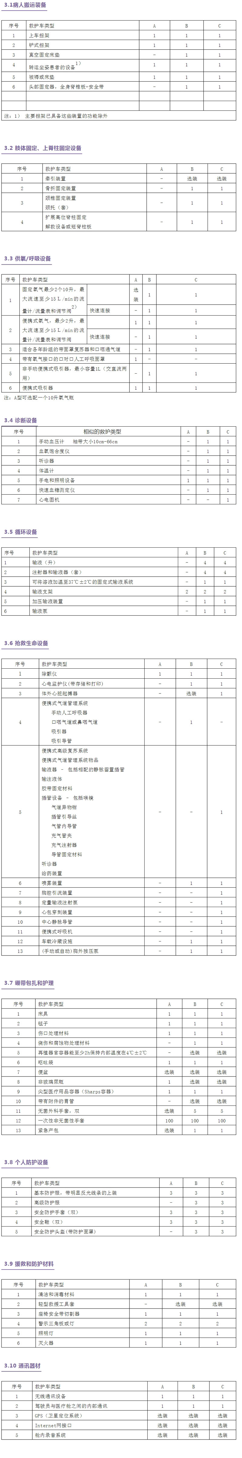 設備裝備時也可由使用單位按本標準購置,表1~表10規(guī)定不同救護車類型所攜帶最少的設備。